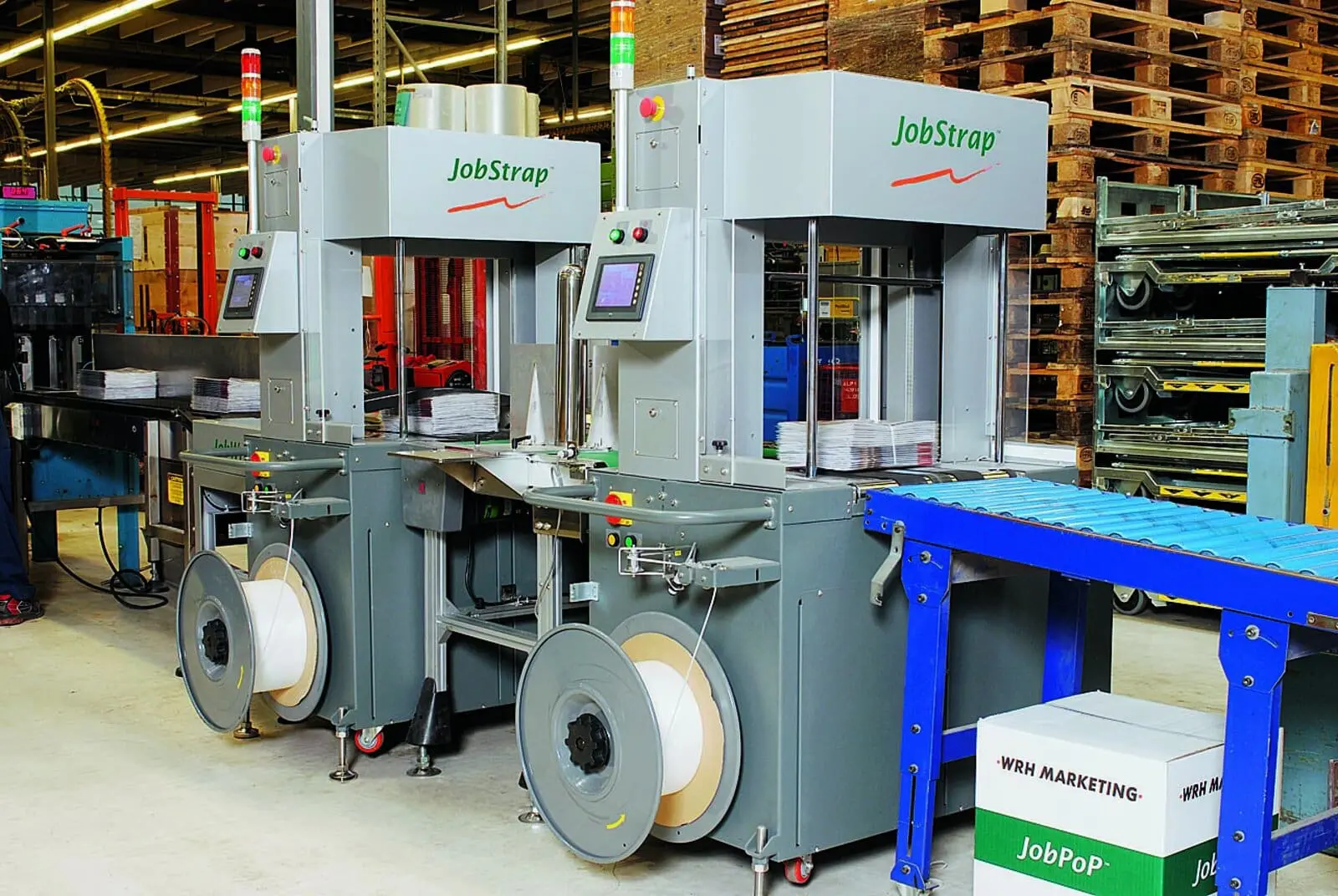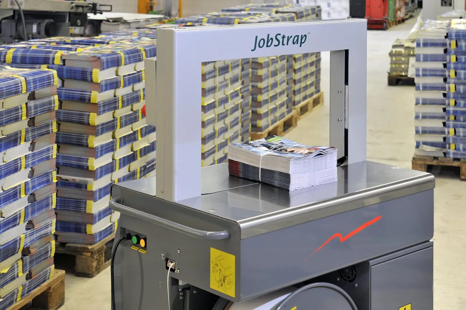 JobStrap™ wird einerseits in der Linie als Tandemmaschine eingesetzt, um Zeitungen oder Magazine sicher zu binden. Andererseits ist auch ein Einsatz als Einzelmaschine möglich, um nur eine Bindung anzubringen.